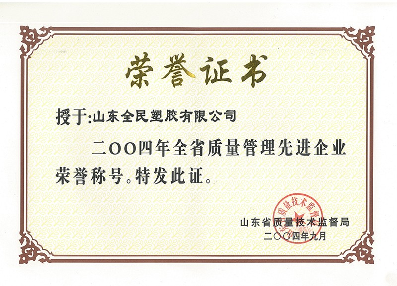 省級質(zhì)量管理先進企業(yè)榮譽證書2004.09